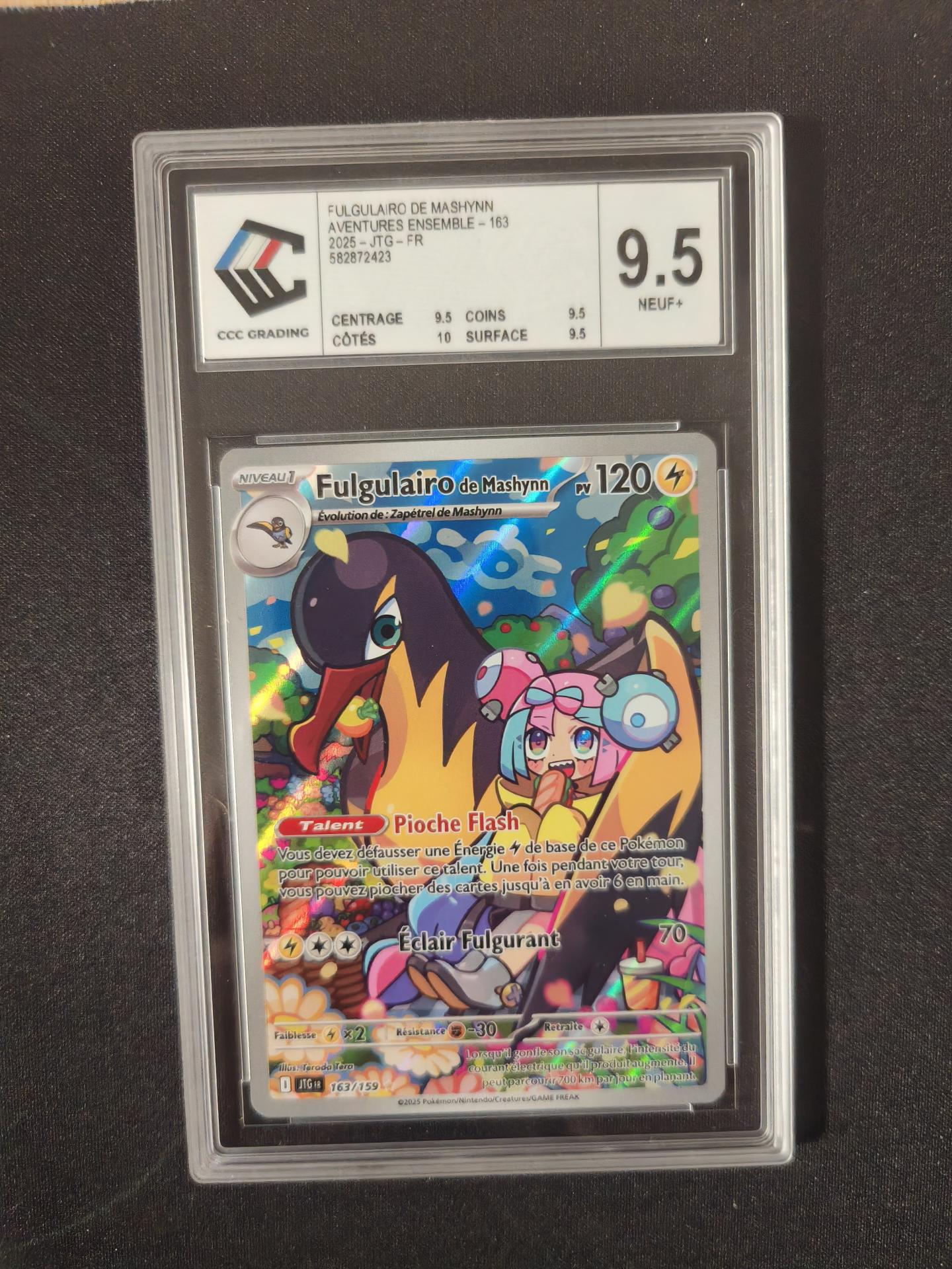 Avec son design percutant et son lien direct avec Mashynn, ce Fulgulairo CCC 9,5 est une pièce de choix pour compléter une collection JTG haut de gamme ou pour mettre en avant un Pokémon moderne apprécié.
