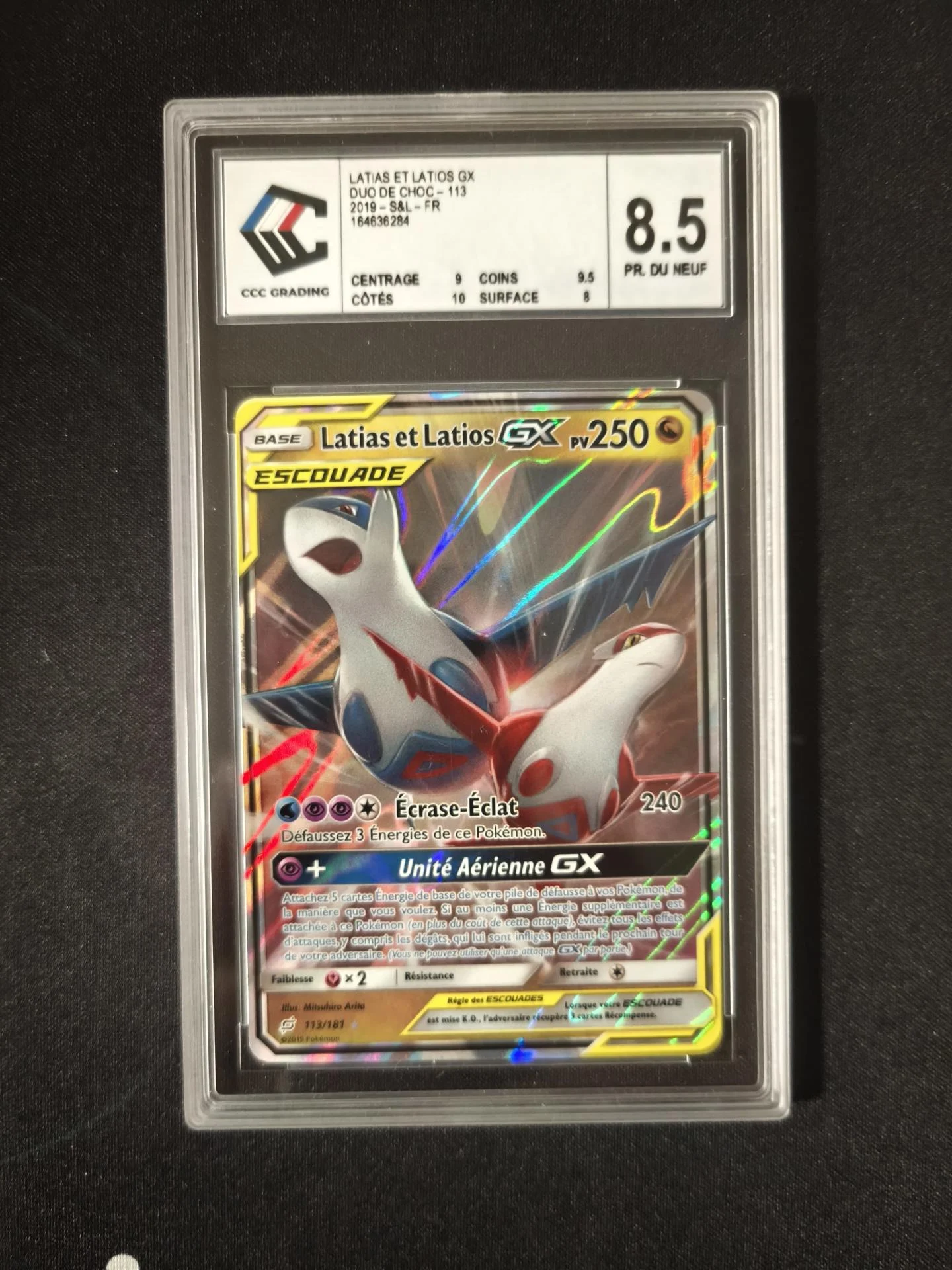 Découvrez ce magnifique Latias & Latios GX (TEU 113) – Version Française, certifié par CCC Grading avec une note de 8,5, un état solide pour cette carte Tag Team emblématique de l’ère Soleil & Lune.