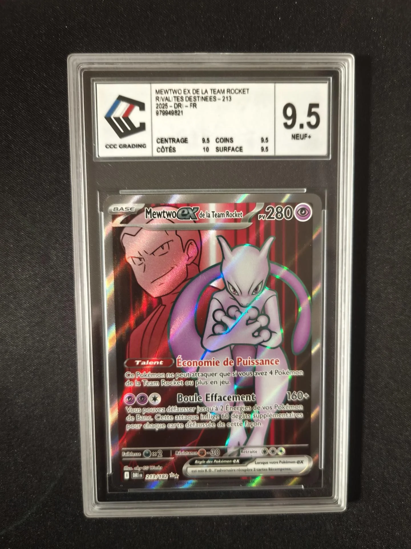 Découvrez ce magnifique Mewtwo ex de la Team Rocket (DRI 213) – Version Française, certifié par CCC Grading avec une excellente note de 9,5 Neuf+.