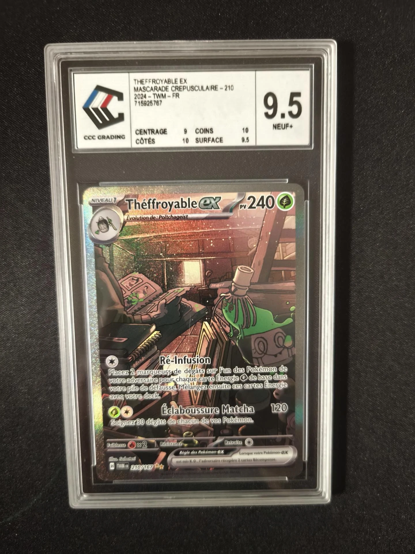 Grâce à son style visuel unique, sa popularité croissante et son état quasi parfait, ce Théffroyable ex CCC 9,5 Neuf+ constitue une pièce idéale pour enrichir une collection moderne, compléter un set TWM ou mettre en avant un Pokémon Spectre au design aussi fun qu’élégant.