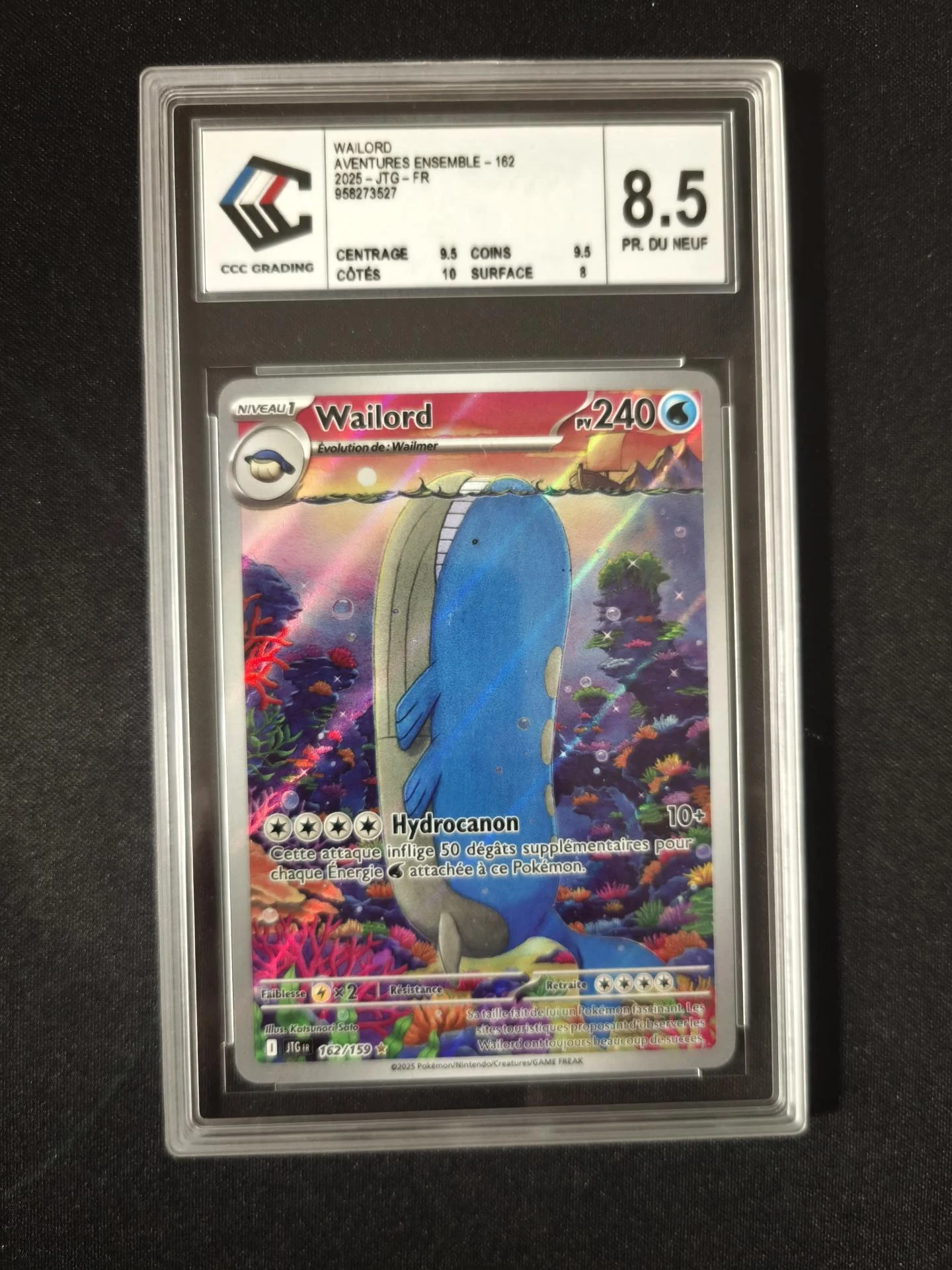 Grâce à son design chaleureux, son statut de Pokémon iconique de Hoenn et sa gradation solide, ce Wailord CCC 8,5 Près du Neuf constitue une très belle pièce pour compléter un set JTG ou enrichir une collection moderne avec un exemplaire certifié et parfaitement présenté.