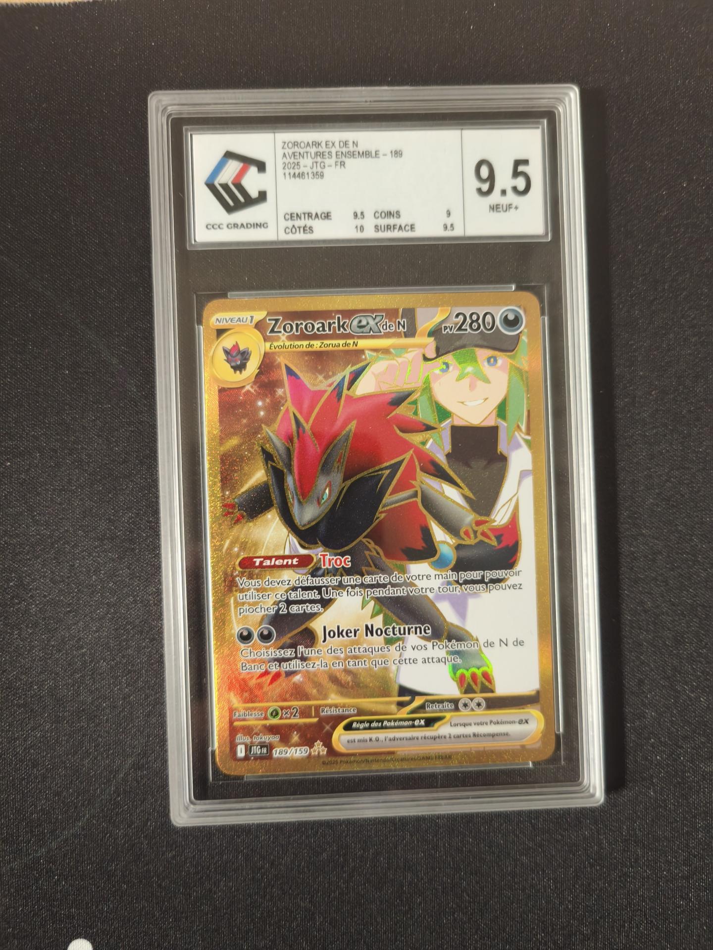 Grâce à son aura, son design percutant et sa gradation élevée, ce Zoroark ex CCC 9,5 Neuf+ est une pièce de choix pour enrichir une collection JTG ou ajouter un Pokémon emblématique à une collection moderne haut de gamme.